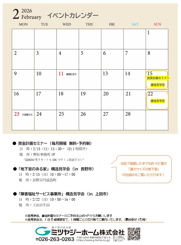 2/15(日)『地下室のある家』構造見学会開催!(長野市)ご予約受付中