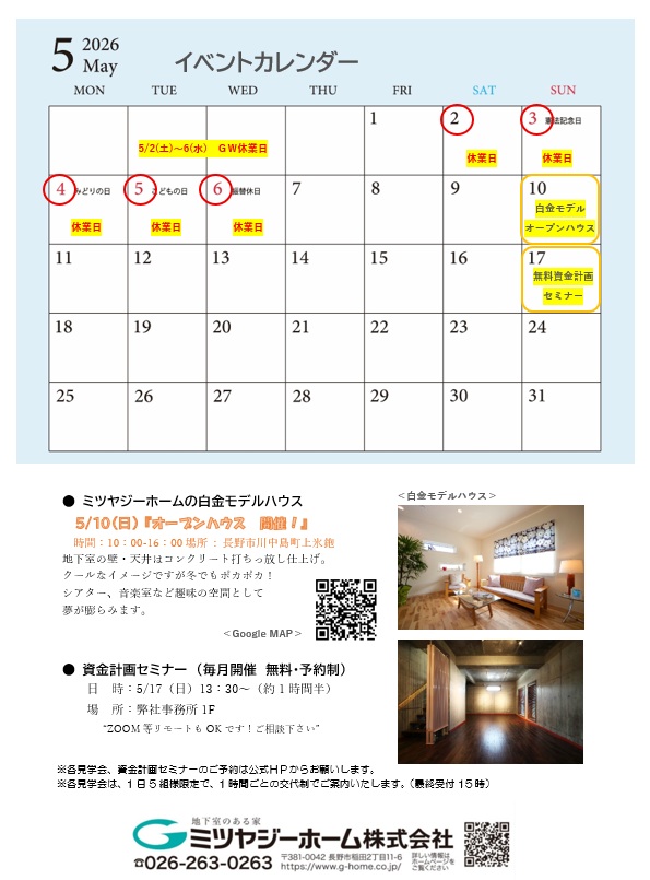 4/26(日) 白金モデルハウス・オープンハウス開催のお知らせ(長野市)ご予約受付中!
